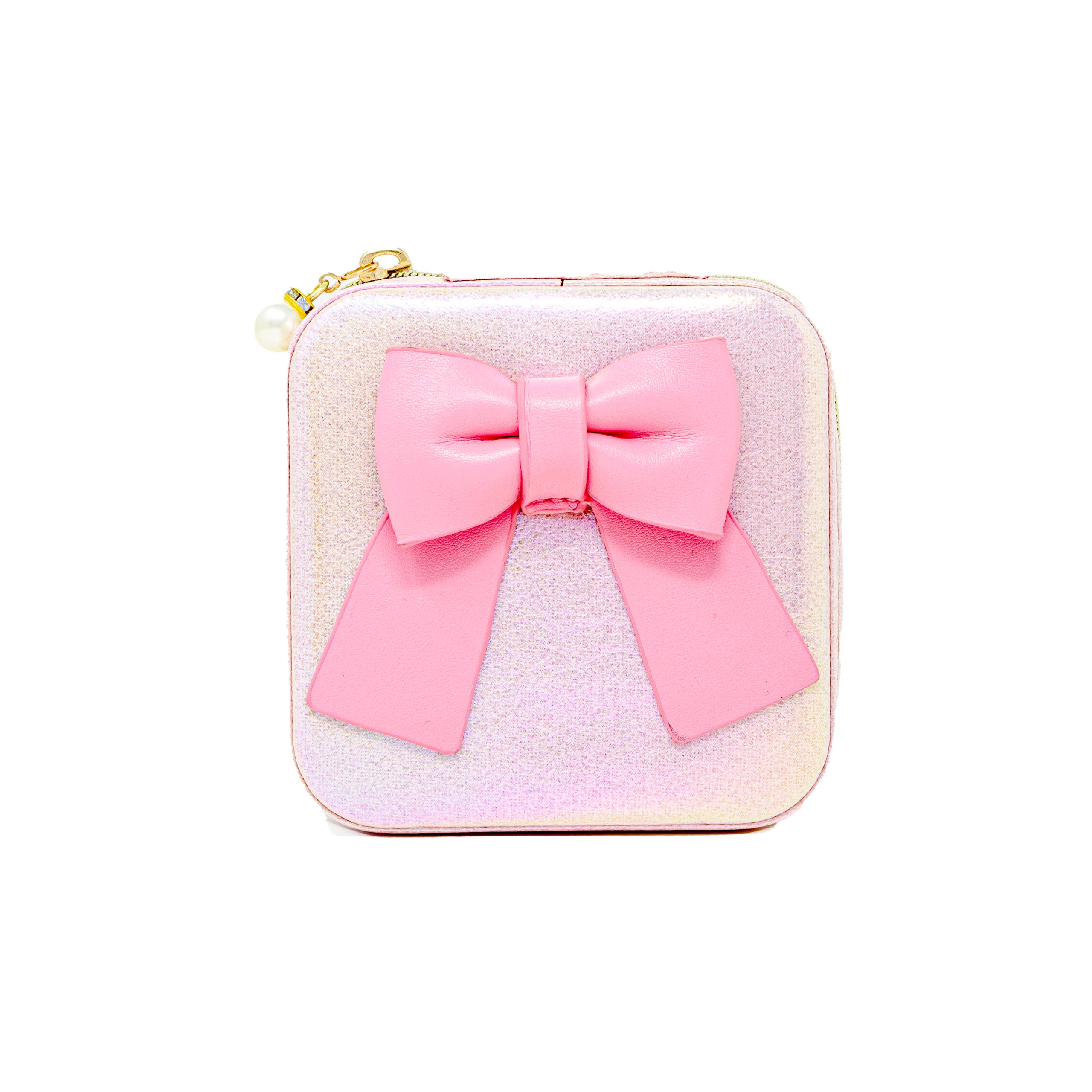 Shiny jewelry box with jumbo bow patch, zip-around closure, and adjustable sections—perfect for organizing all her favorite accessories!
